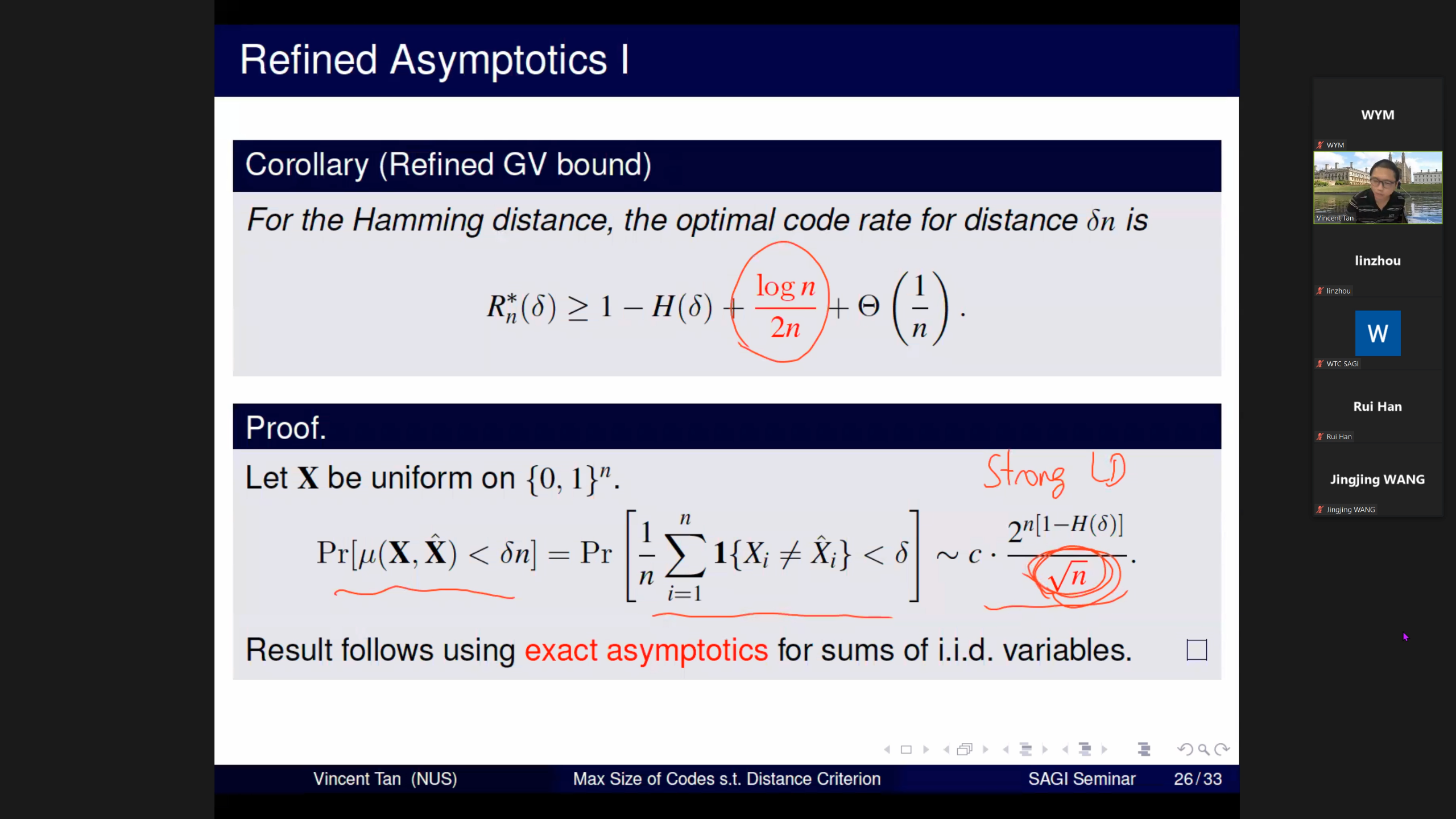 在报告中,Tan教授首先介绍了分组编码以及距离约束与编码速率的关系,并回顾了经典的Gilbert-Varshamov (GV) 界。随后,Tan教授深入浅出地讲解了构造任意距离约束下最优编码方案的方法,并针对离散与连续信源的情形讲解了详细过程。Tan教授进一步对主要结果进行了二阶(Second-order)以及大偏差(Large Deviation)渐进分析,从不同角度揭示了该最优编码方案的性能。